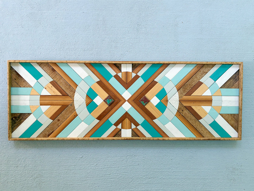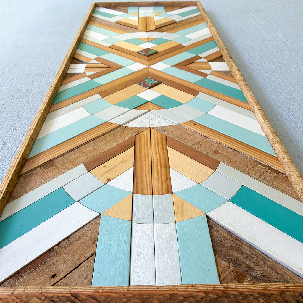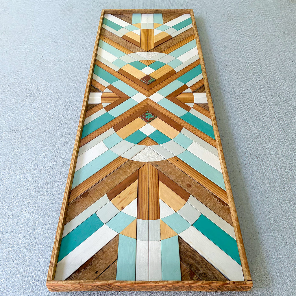 This one of a kind piece is handcrafted using a variety of locally salvaged wood from Wilmington, NC. Artwork inlayed with natural copper patina.